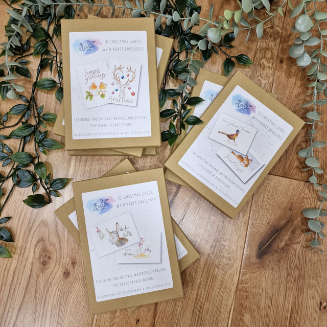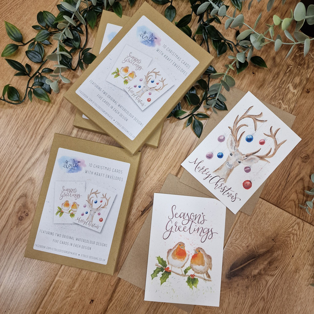 Pack of 10 Christmas cards featuring two of my original watercolour paintings, 5 cards in each design.
